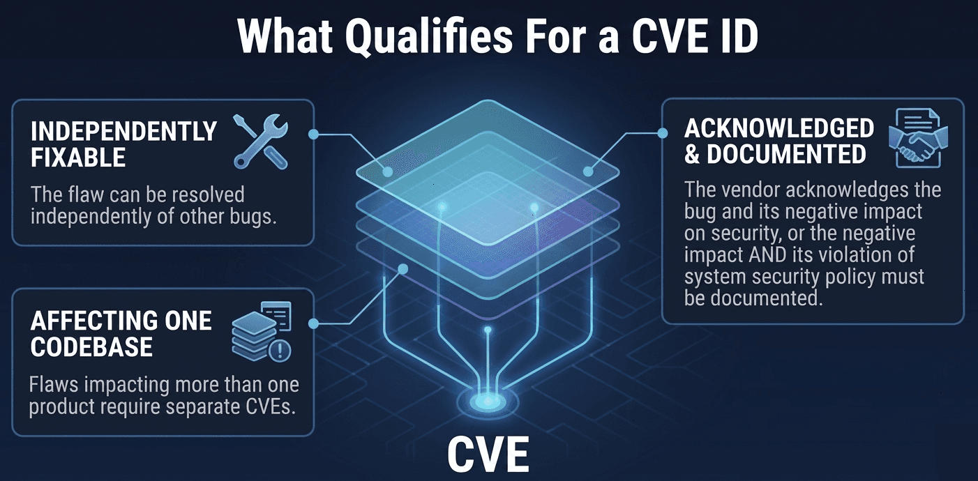 Not every software bug earns a CVE. MITRE applies to three strict criteria. A vulnerability must: